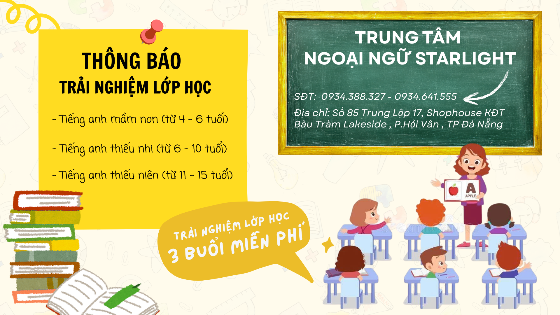 – Mỗi học sinh được thầy cô và cô chủ nhiệm QUAN TÂM theo cách riêng như tổ chức sinh nhật, giúp ôn bài miễn phí, ôn tập ngữ pháp miễn phí. Các em học sinh tiêu biểu của lớp được vinh danh trên www.starlightenglishdanang.com .