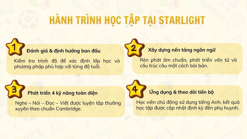 Trung tâm Ngoại ngữ Starlight tự hào mang đến cơ hội học tập xuất sắc cho học sinh Việt Nam, đặc biệt dành cho các em từ 10 đến 14 tuổi với nền tảng tiếng Anh vững chắc.