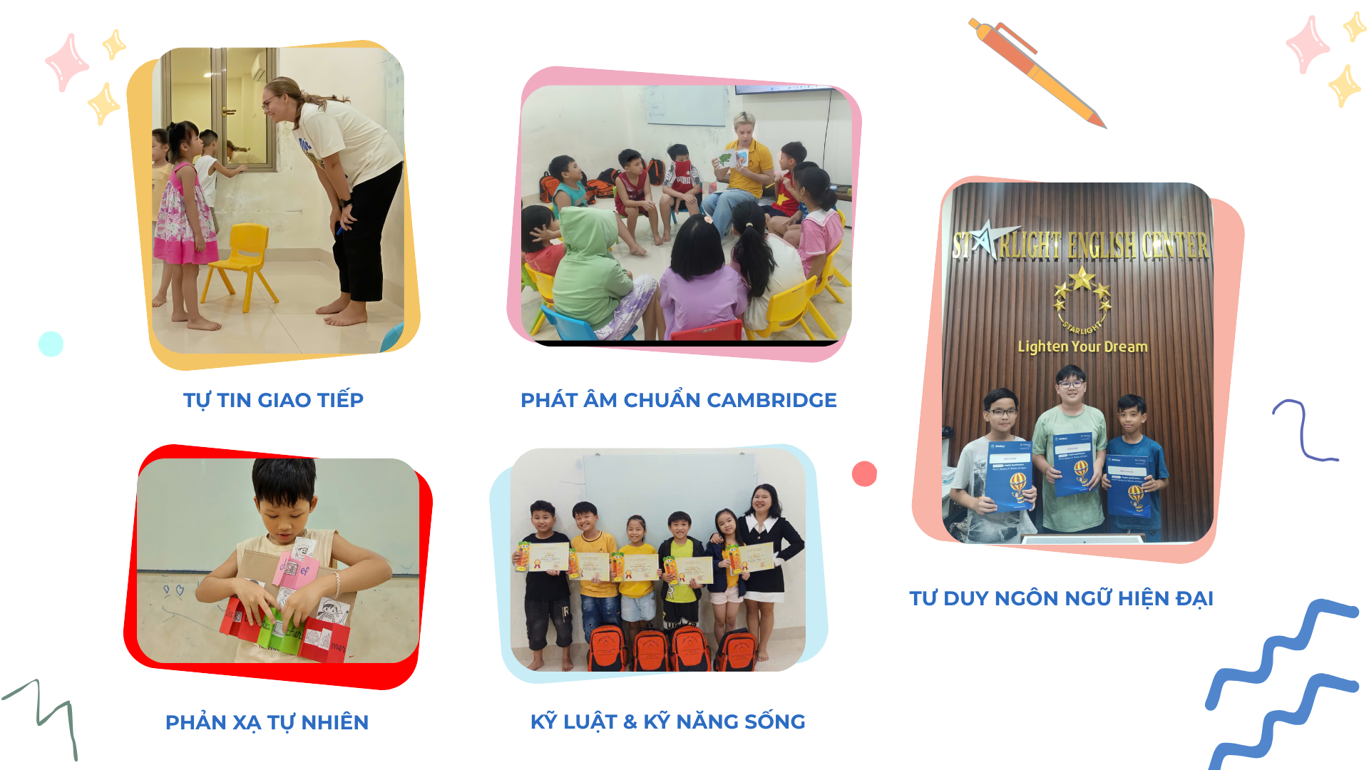 Học tiếng Anh ở trung tâm Starlight thật là vui! Chúng em tham gia nhiều trò chơi, hoạt động nhóm và hát bài hát bằng tiếng Anh , nên học mà không hề nhàm chán. Nhờ đó, em nhớ được nhiều từ mới, nói được nhiều câu hơn và dám trò chuyện với bạn bè cũng như cô giáo. Mỗi buổi học xong, em đều cảm thấy tự tin hơn và thấy học tiếng Anh thật thú vị.